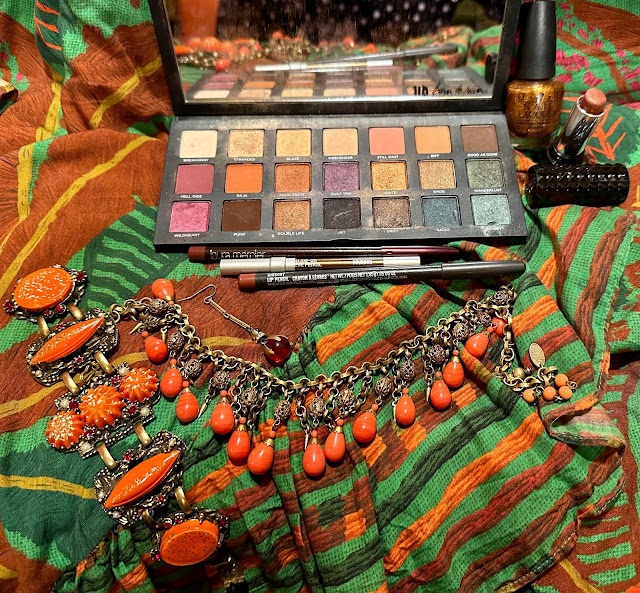My make-up with this outfit included...Urban Decay eyeliner in Bourbon; Laura Mercier lipliner (used as eyeliner) in Red Chocolate; Blaze, Accelerate, & Radio eyeshadow from UD; Chicory lipliner by MAC; KVD lipstick in Gothica; & OPI nail polish in A Woman's Prague-ative.