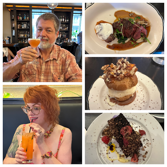 Coup du Jour (market beef, braised beef short rib, foraged mushrooms, potato bone, turnip, wilted spinach, bordelaise, blue cheese espuma). Second round of drinks: Rios Mios (Pitu cachaca, Smith & Cross rum, Finocchietto, strawberry purée, honey syrup, lime) & Doc's Orders (Death's Door gin, Saler's gentian, carrot tarragon syrup, lemon tonic water, celery bitters, dukkah carrot rim). Dessert: Caramel Pecan Profiterole (Amish maple ice cream, salted caramel) & Dark Chocolate Cake (vanilla bean anglaise, summer berries, cocoa nib crumble). My favorites were: Duck Confit Toast, Pork Loin, & Caramel Profiterole. Overall, a decent meal...we like to go to Heritage for restaurant week because they rarely make changes to their daily menu & it's wonderful to try something new.